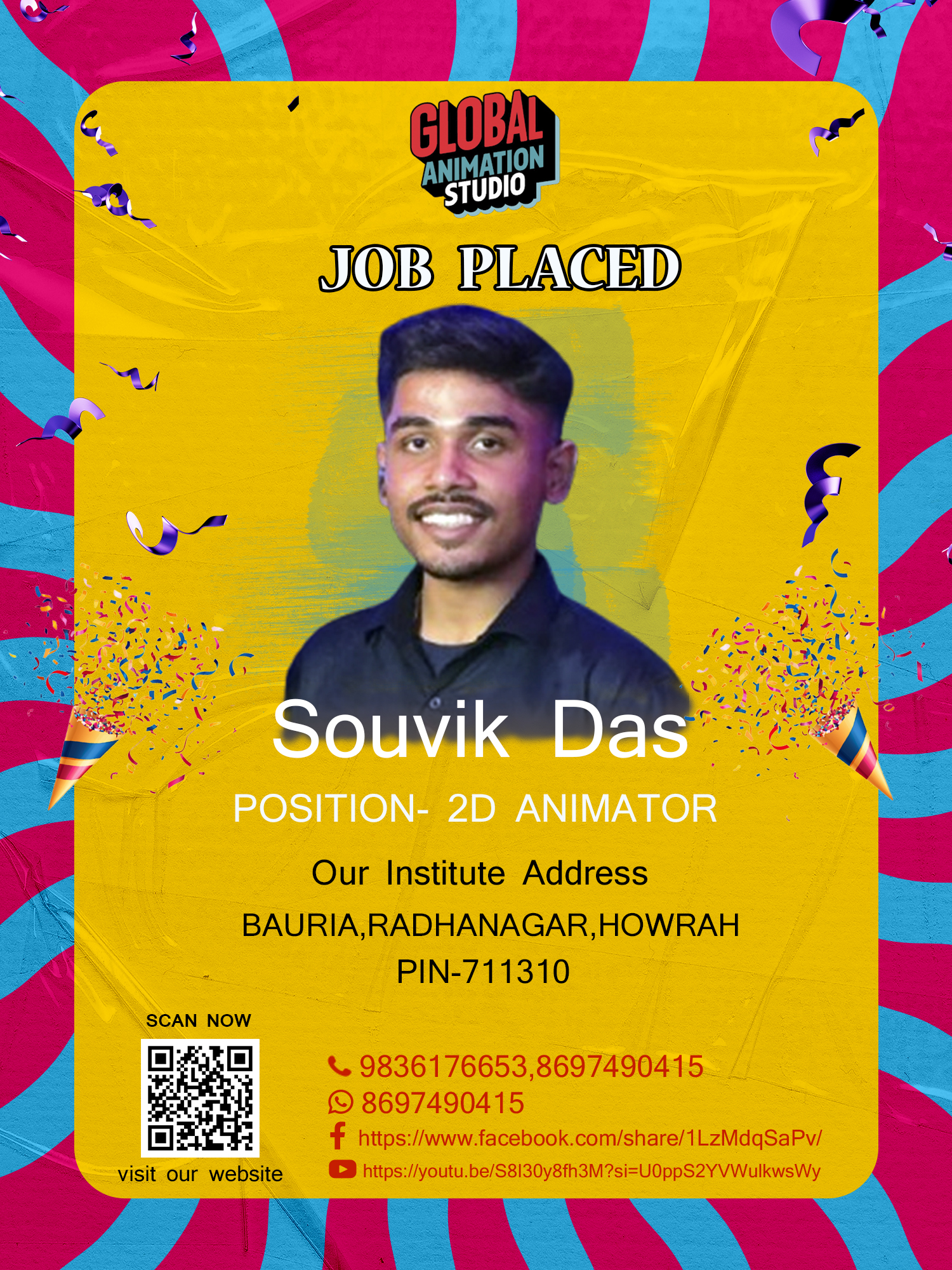 The service we provide for student Special discounts are available on each course fee 5 star Rating job placement review for our students CLASS TOUR Class Activity Our Student Memory Myself Chayan dhara. I am owner of ‘Global Animation Studio’.I am 2d Animator.I have experience of 10 years in this field. Contact usPhone no-9836176653 whatsapp-8697490415Email ID-globalanimationstudio2024@gmail.com